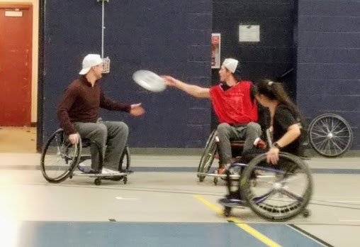 While we observed and took pictures, a steady stream of students came to the gym to give it a try and enjoy pizza. Not quite as easy as it looks when they first sit in the chair and try maneuvering the wheelchair while catching and throwing a frisbee. If lucky enough to catch it, they then had to get down the court and over the goal line to score. Some misses, some crashes, but many smiles as they navigated their way around the court.