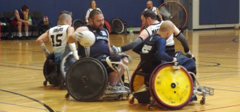 - Wheelchair Rugby (AKA Quad Rugby, Murderball) is a fast-paced collision sport played in specially designed wheelchairs. The sport was initially created for athletes with spinal cord injuries and players are rated based on the level of function they have. It is a combination of rugby and team handball played by teams of 5 on a basketball court. One point is scored by wheeling across the goal line. Players can collide into each other to impede their progress and try to steal the ball.